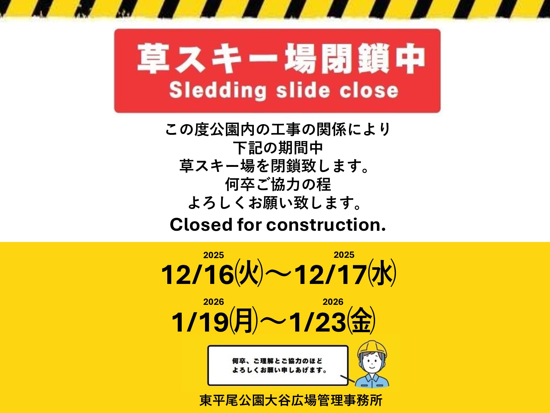 公園内工事の関係により、2025/12/16㈫~12/17㈬は草スキーはご利用頂けません。