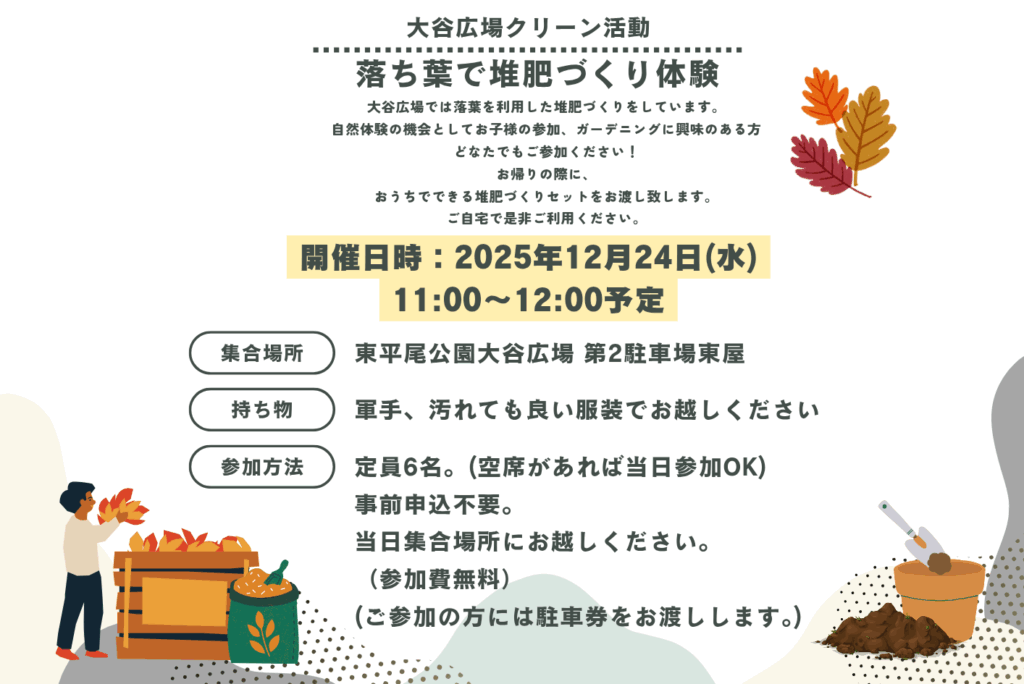 大谷広場第二駐車場東屋にて、堆肥づくりのワークショップを開催します。 -